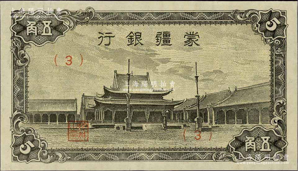 蒙疆银行(1944年)小庙图五角,(3)号券,资深藏家出品,九八成新