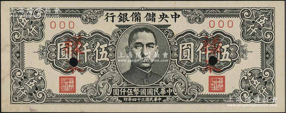 民国三十四年(1945年)中央储备银行狭长版伍仟圆样本,资深藏家出品,未折九五成新