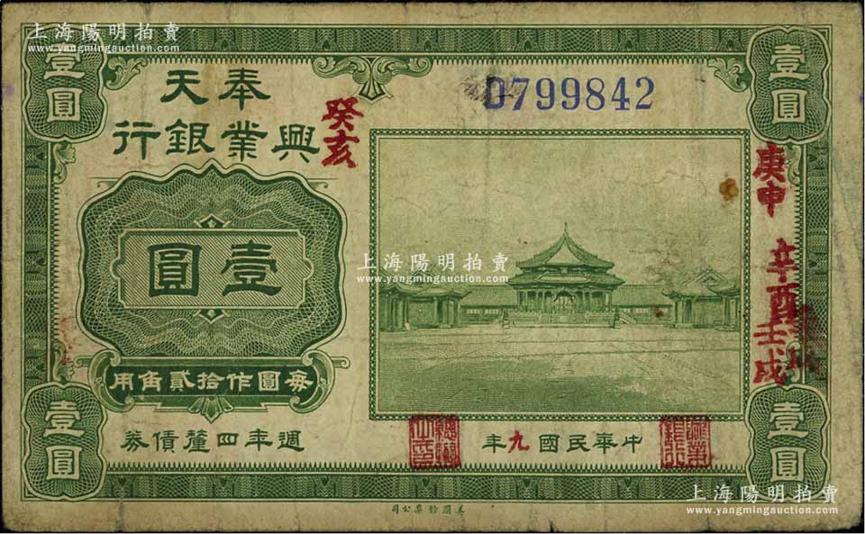民国九年(1920年)奉天兴业银行週年四厘债券美钞版绿色壹圆,源于著名集钞家吴筹中先生之旧藏,七五成新