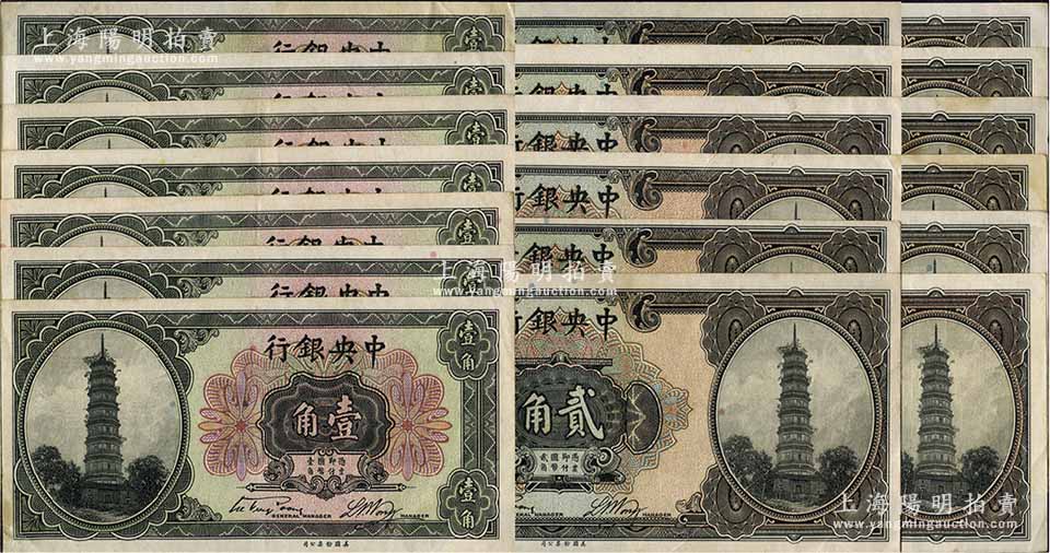 中央银行“花塔图”辅币共19枚,详分:宋子文·黄隆生签名之壹角2枚、贰角7枚,李觉·黄秀峰签名壹角5枚,李觉·杨晓波签名贰角5枚;前辈藏家出品,八至九成新,敬请预览