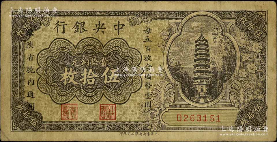 中央银行当拾铜元伍拾枚,限陕省境内通用,单字轨,香港藏家出品,少见,原票七五成新