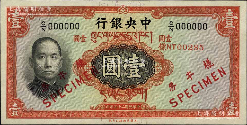 民国二十五年(1936年)中央银行华德路版壹圆藏文券样本,正背共2枚,此种藏文券样本迄今为之仅见,亦属首度公诸于拍卖;源于江南前辈藏家之秘藏,九八成新