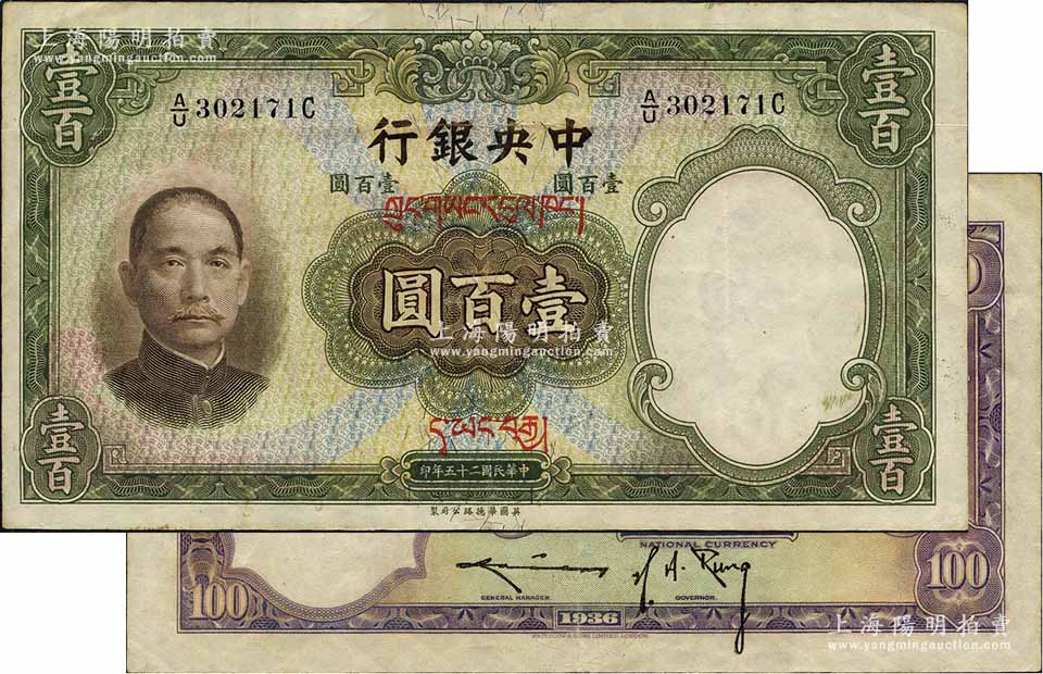 民国二十五年(1936年)中央银行藏文券壹百圆,A/U字轨真券(注:坊间所见其它字轨者均属伪盖券),背为孔祥熙·李骏耀长脚签;台湾前辈藏家出品,此真券存世罕见,值得重视,八成新
