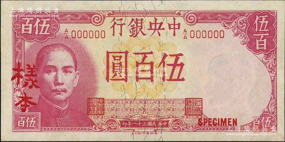 民国三十一年(1942年)中央银行德纳罗版伍百圆样本券,正背共2枚,江南前辈藏家出品,九八成新