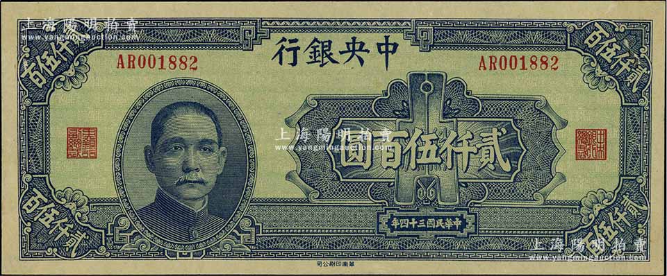 民国三十四年(1945年)中央银行华南版贰仟伍百圆,九五成新