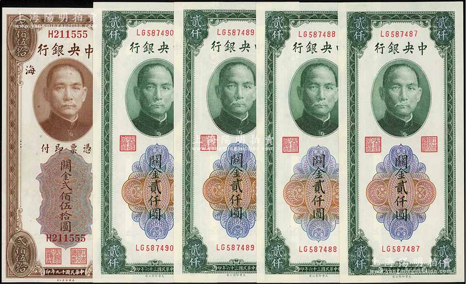 中央银行关金券5枚,详分:1930年美钞版贰佰伍拾圆,单字轨,其尾号为555豹子号;1947年大业版贰仟圆4枚连号;九八至全新