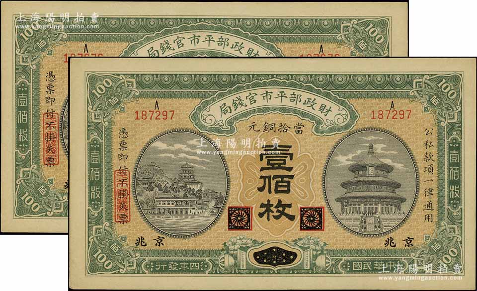 民国四年(1915年)财政部平市官钱局当拾铜元壹佰枚共2枚,黑龙江改京兆地名,源于前辈名家之遗存,九五成新