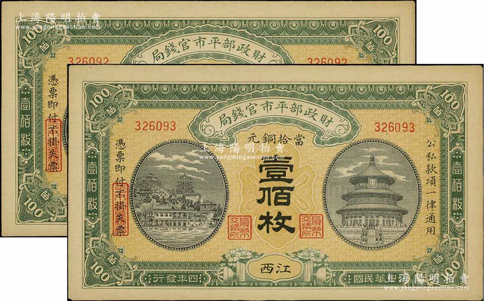 民国四年(1915年)财政部平市官钱局当拾铜元壹佰枚共2枚连号,江西地名,源于前辈名家之遗存,九五成新