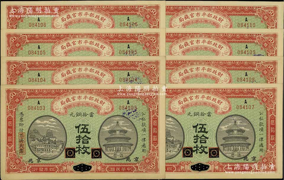 民国四年(1915年)财政部平市官钱局当拾铜元伍拾枚共8张连号,黑龙江改京兆地名,未折九五成新
