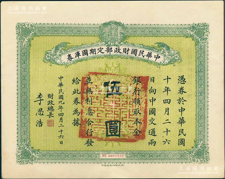 民国九年4月26日(1920年)中华民国财政部定期国库券伍圆,由财政总长李思浩(浙江慈溪人)签名,前辈藏家出品,八五成新