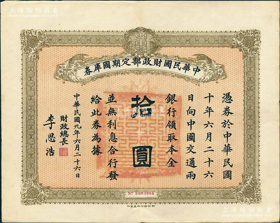 民国九年6月26日(1920年)中华民国财政部定期国库券拾圆,由财政总长李思浩(浙江慈溪人)签名,前辈藏家出品,八五成新