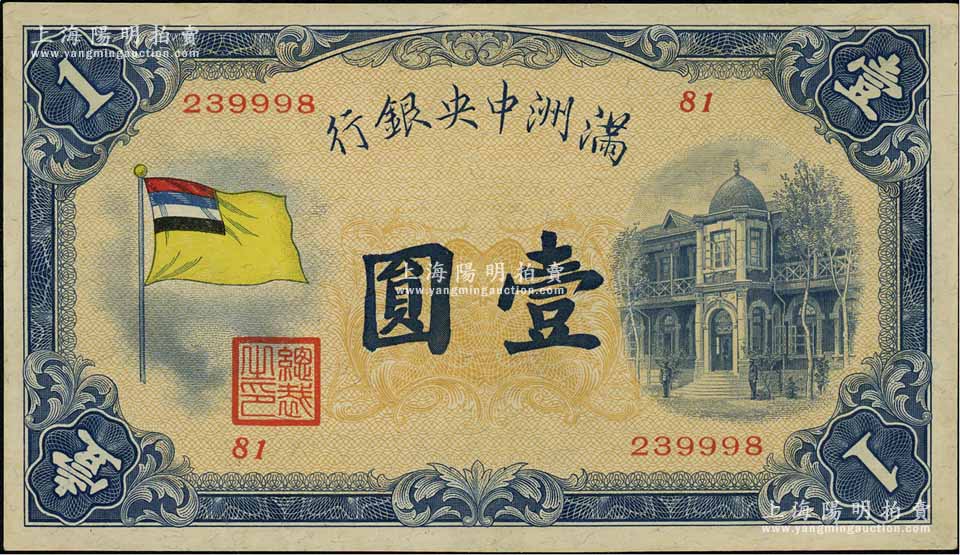 满洲中央银行(1932年)甲号券五色旗版壹圆,第81号券,九至九五成新