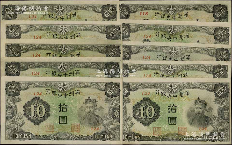 满洲中央银行丙改券(1944年)短号拾圆共10枚,九五至九八成新