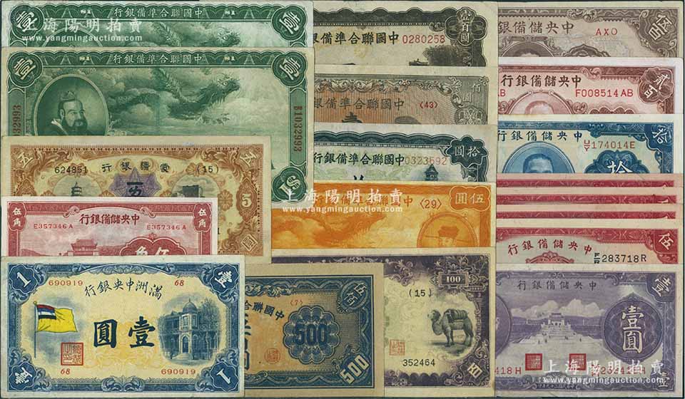 日伪纸币共19枚,详分:满洲中央银行(1932年)甲号券五色旗版壹圆;蒙疆银行宝塔五圆、骆驼百圆;中国联合准备银行1938年大龙壹圆2枚、小龙伍圆,无年份左关羽右塔拾圆、左帝右楼阁百圆、左楼阁右帝壹百圆、天坛短号伍百圆;中央储备银行1940年棕红伍角、紫壹圆、伍圆4枚、拾圆,1943年长框短号伍百圆、1944年贰百圆;江南雁门堂藏品,整体品相尚佳,其中1枚有修补,七五至全新,敬