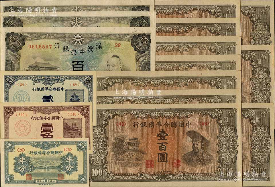 日伪纸币共16枚,详分:满洲中央银行(1945年)丙号券百圆共3枚连号,背印粮仓图;中国联合准备银行1938年半分、壹角、贰角,(1945年)左楼阁右黄帝图壹百圆共10枚,均为<43>号券;除6枚为九至九五成新外,其余为全新,敬请预览