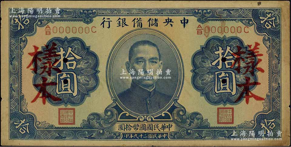 民国二十九年(1940年)中央储备银行第二版拾圆样本,单面号码黑色签名,八五成新
