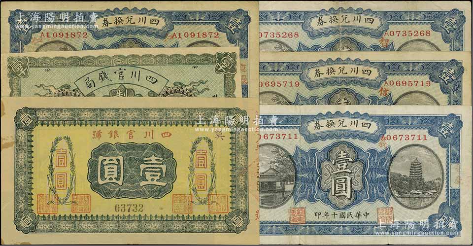 川钞6种,详分:四川兑换券1921年壹圆4枚,重庆地名,其冠字分别为“仁、义、智、信”;四川官银号无年份版横式壹圆;四川官钱局1924年制钱壹千文;七至九成新,敬请预览