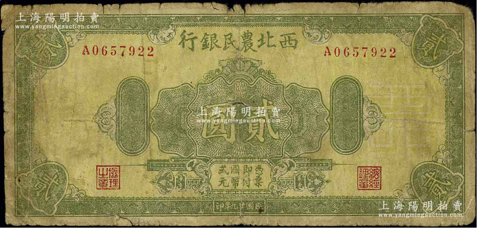 民国廿九年(1940年)西北农民银行绿色花纹图贰圆,六五成新
