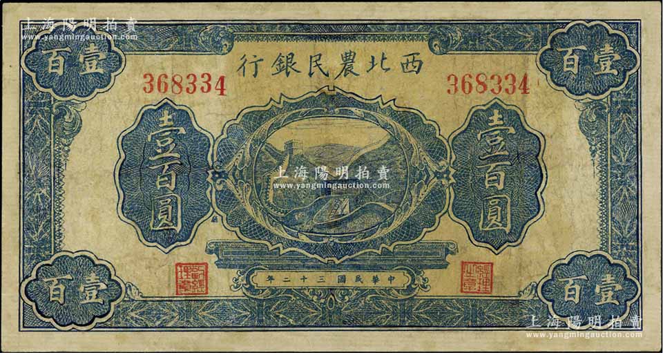 民国三十二年(1943年)西北农民银行蓝色长城图壹百圆,有修补,七成新