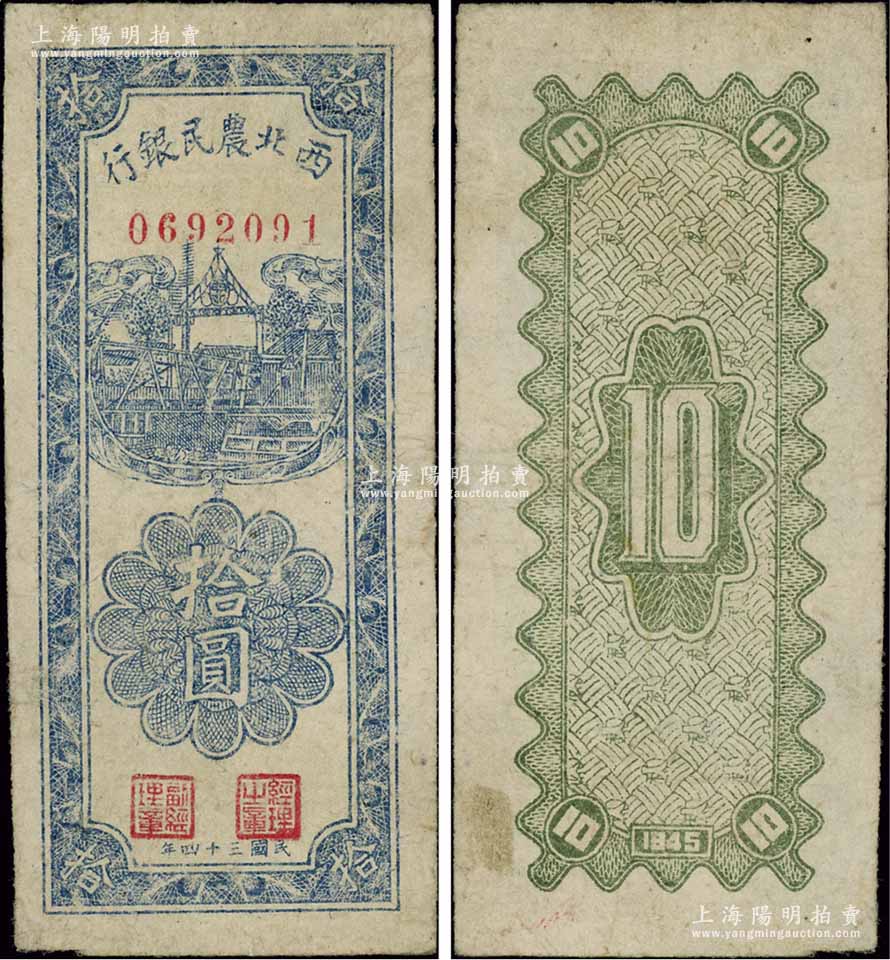 民国三十四年(1945年)西北农民银行竖式拾圆,原票八成新