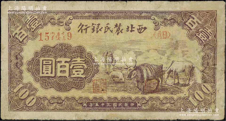 民国三十五年(1946年)西北农民银行马牛羊图壹百圆,少见品种,有小修,七至七五成新