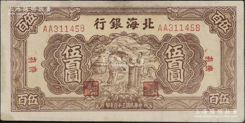 民国三十六年(1947年)北海银行棕色扬谷图伍百圆,渤海地名,AA字轨,八成新