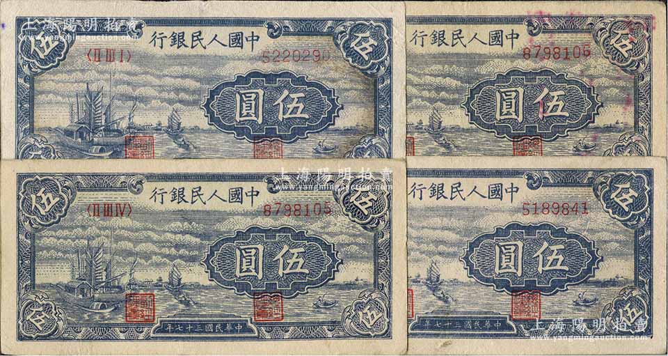 第一版人民币“帆船图”伍圆共4枚,七至八成新