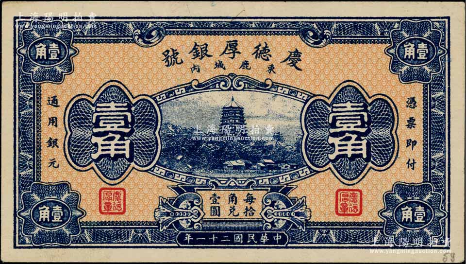 民国二十一年(1932年)庆德厚银号壹角,河北束鹿县钱庄钞票,上印杭州六和塔,由北平财政部印刷局印制;白尔文先生藏品,近九成新