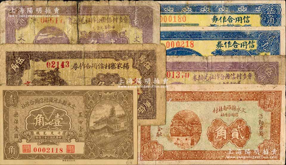 文水县纸币7种,详分:文水县上河头村信用合作社1934年壹角,杨家寨村信用合作券1935年伍角,章多村信用合作社兑换券1935年贰角、伍角,文水县西南社村信用合作社1937年贰角,文水县北武劳村信用合作券1937年贰角、伍角;白尔文先生藏品,其中1枚有贴补,五至九成新