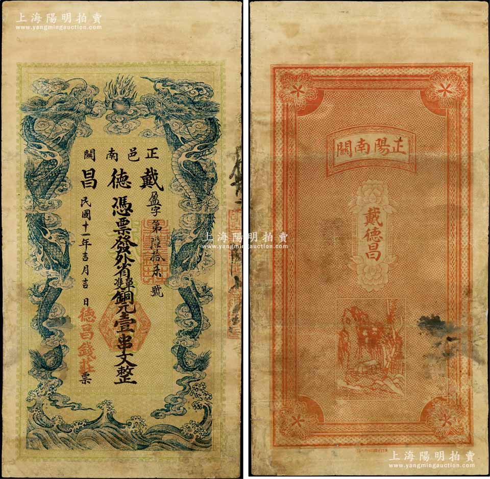 民国十一年(1922年)戴德昌·凭票发外省单双铜元壹串文,河南正阳县钱庄钞票,上印双龙戏珠图;白尔文先生藏品,罕见,有修补,七五成新