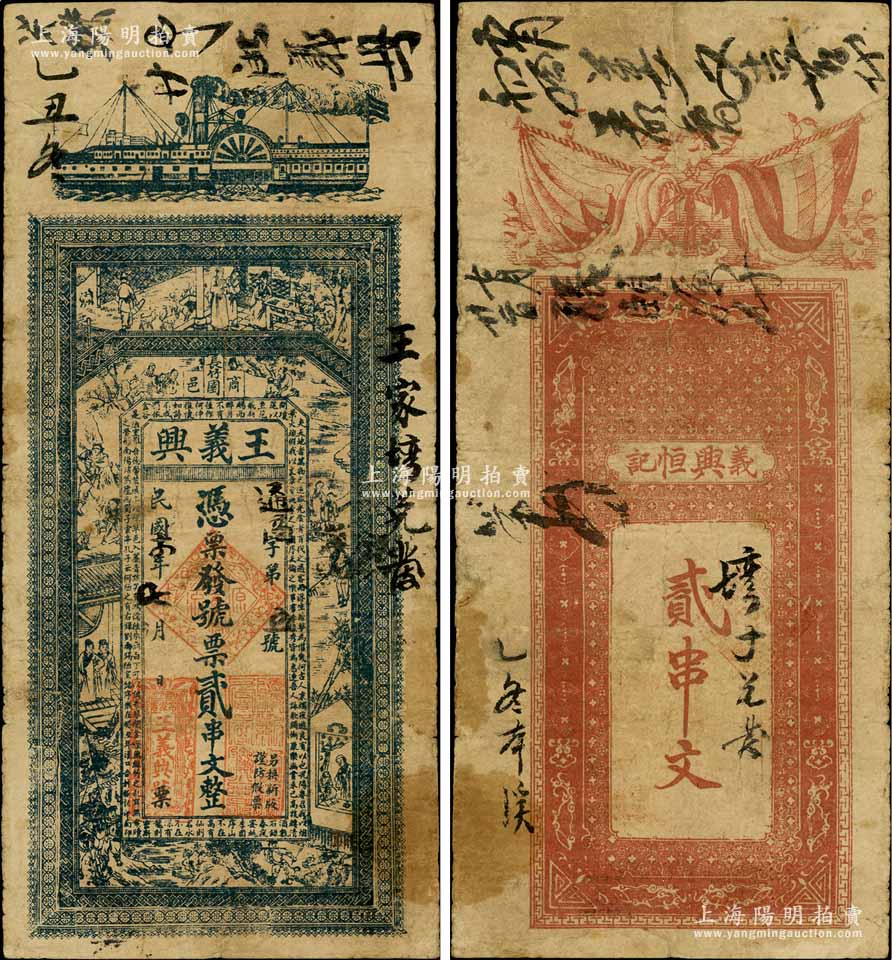 民国十四年(1925年)王义兴贰串文,河南商城县钱票,上印轮船、古人物、唐代李白《春夜宴桃李园序》和刘禹锡《陋室铭》古文,背印辛亥双旗;白尔文先生藏品,七五成新