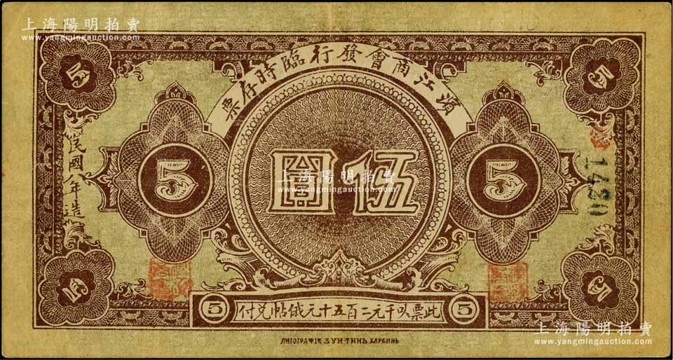 民国八年(1919年)滨江商会发行临时存票伍圆,黑色号码券,以沙俄羌帖为货币单位;白尔文先生藏品,八成新