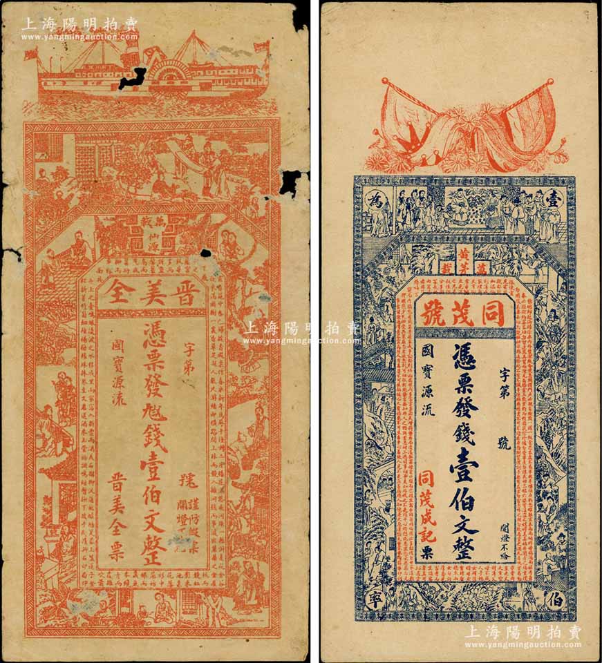 江西万载县钱票2种,详分:同茂号壹伯文,上印辛亥革命双旗、二十四孝图及《治家格言》古文,背印《滕王阁序》等古文;晋美全壹伯文,上印古人物及南朝庾信《春赋》古文;白尔文先生藏品,其中1枚有破损,六至八五成新