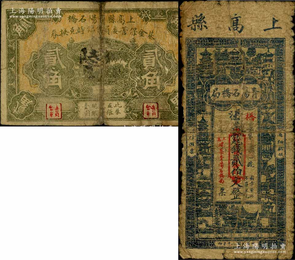 上高县青阳石桥局1931年贰伯文、上高县青阳石桥基金保管委员会临时兑换券无年份版贰角共2枚不同,其中贰伯文券背印孙中山像;白尔文先生藏品,六至七成新