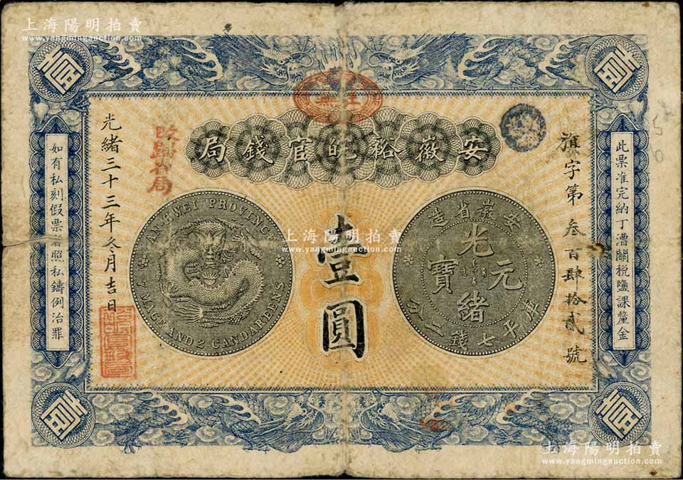 光绪三十三年(1907年)安徽裕皖官钱局壹圆,加盖“驻芜”(芜湖)椭圆形地名章和“改归省局”红字;白尔文先生藏品,七至七五成新