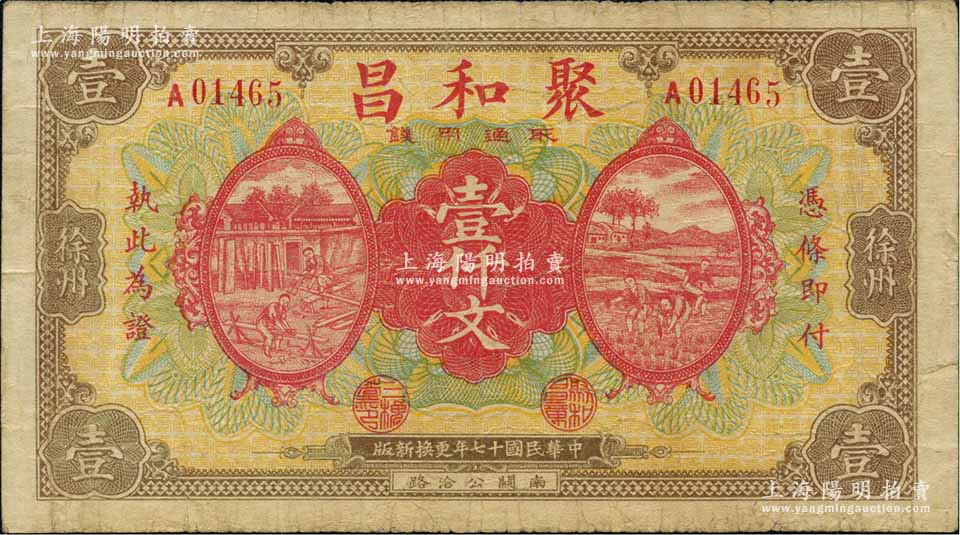 民国十七年(1928年)聚和昌壹仟文,江苏徐州府钱庄钞票,上印锯木与插秧图;白尔文先生藏品,少见,七五成新