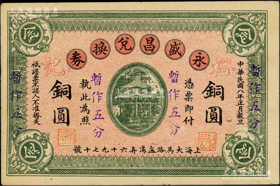 民国八年改1939年永盛昌兑换券铜圆念枚暂作五分,上印凉亭图,背印大世界楼房,属老上海钱庄轿饭票改造为孤岛时期之代价券,《老上海代价币代价券》一书未收录;白尔文先生藏品,罕见,八五成新