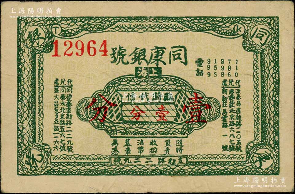 (上海)同康银号临时代价壹分,发行于孤岛时期,银号发行者尤为稀少;白尔文先生藏品,少见,八成新