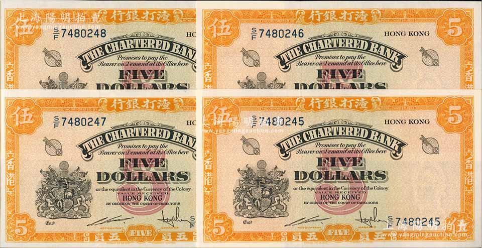 渣打银行(1967年)黄色伍员共4枚连号,香港地名,海外回流品,全新