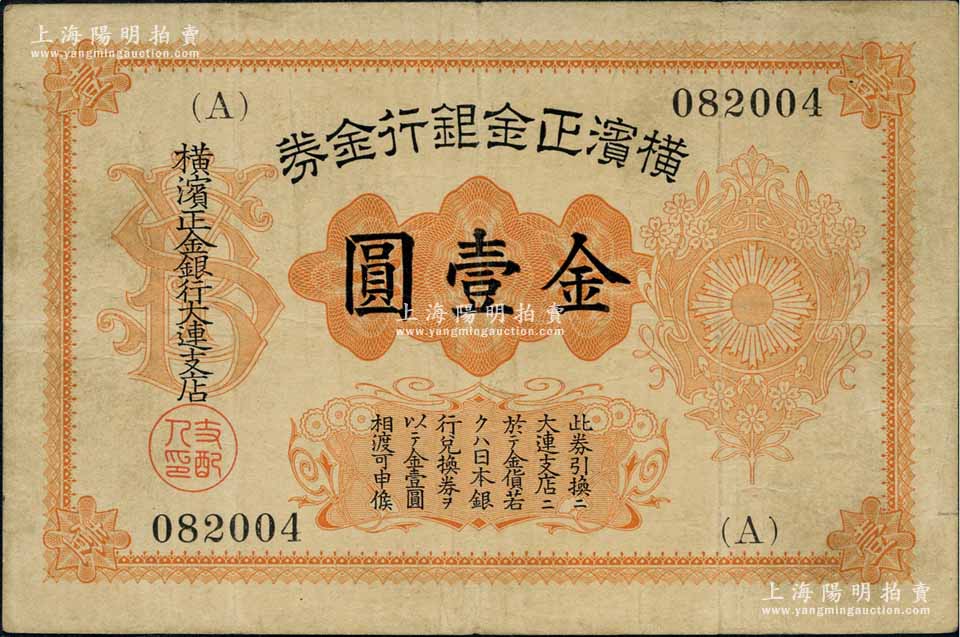 横滨正金银行金券(1916年)金壹圆,上印旭日章,大连地名;美国奚峥云先生藏品,美国克劳斯《世界纸币标准目录》无定价(Rare珍稀级),八成新