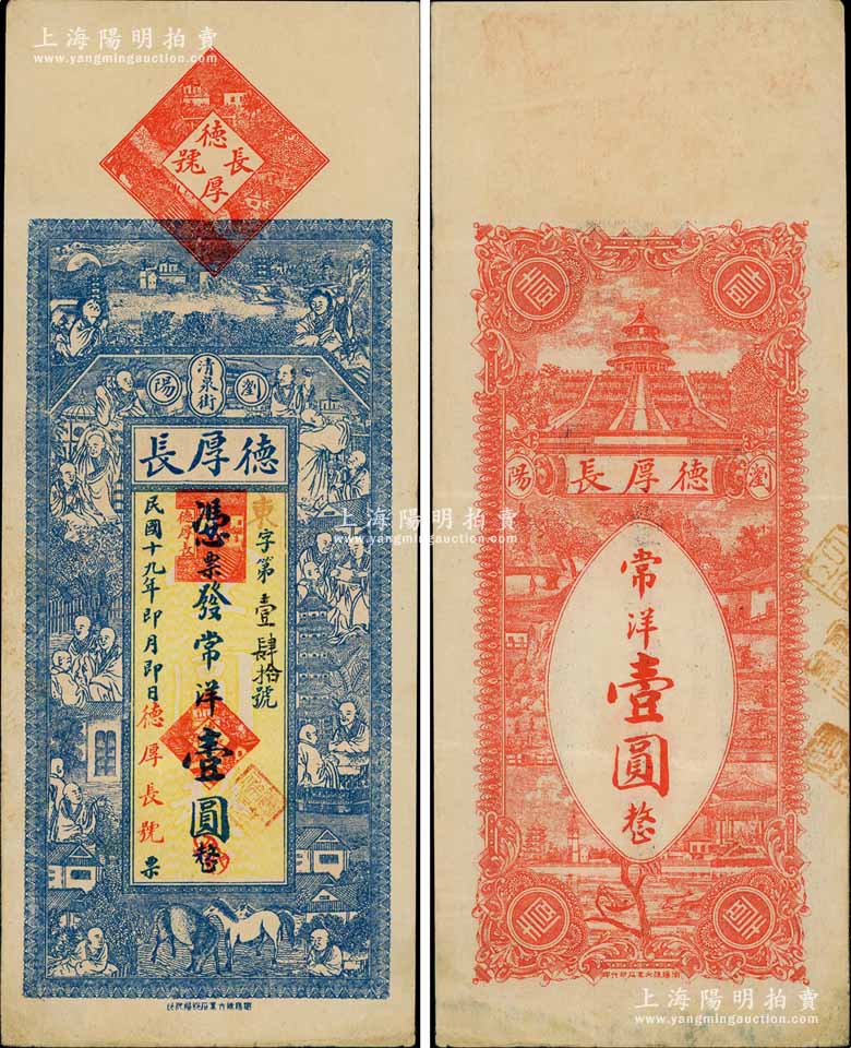 民国十九年(1930年)德厚长常洋壹圆,湖南浏阳县钱庄钞票,上印和合二仙、十八罗汉图,背印天坛及风景图,形制美观;海外回流品,少见,八五成新