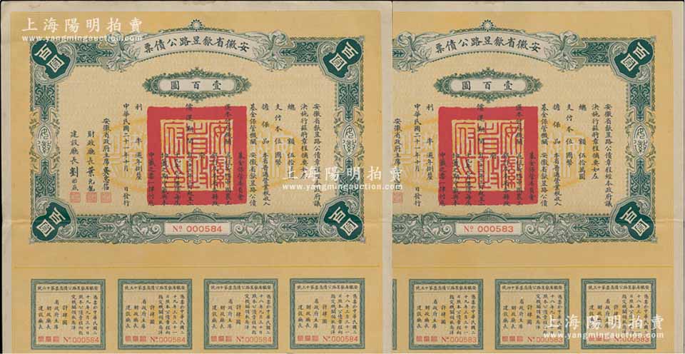 民国二十一年(1932年)安徽省歙昱路公债票壹百圆共2枚连号,由安徽省主席吴忠信(国民政府要员、历任蒙藏委员会委员长等职,1940年2月曾主持西藏第14世达赖即位大典)等签署,附带有息票,八五成新