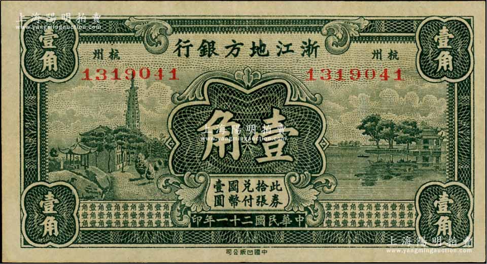 民国二十一年(1932年)浙江地方银行壹角,杭州地名,九八成新