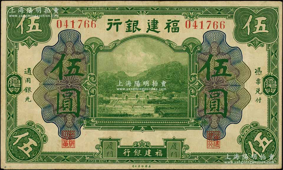 福建银行美钞版绿色伍圆,厦门地名,资深藏家出品,八成新