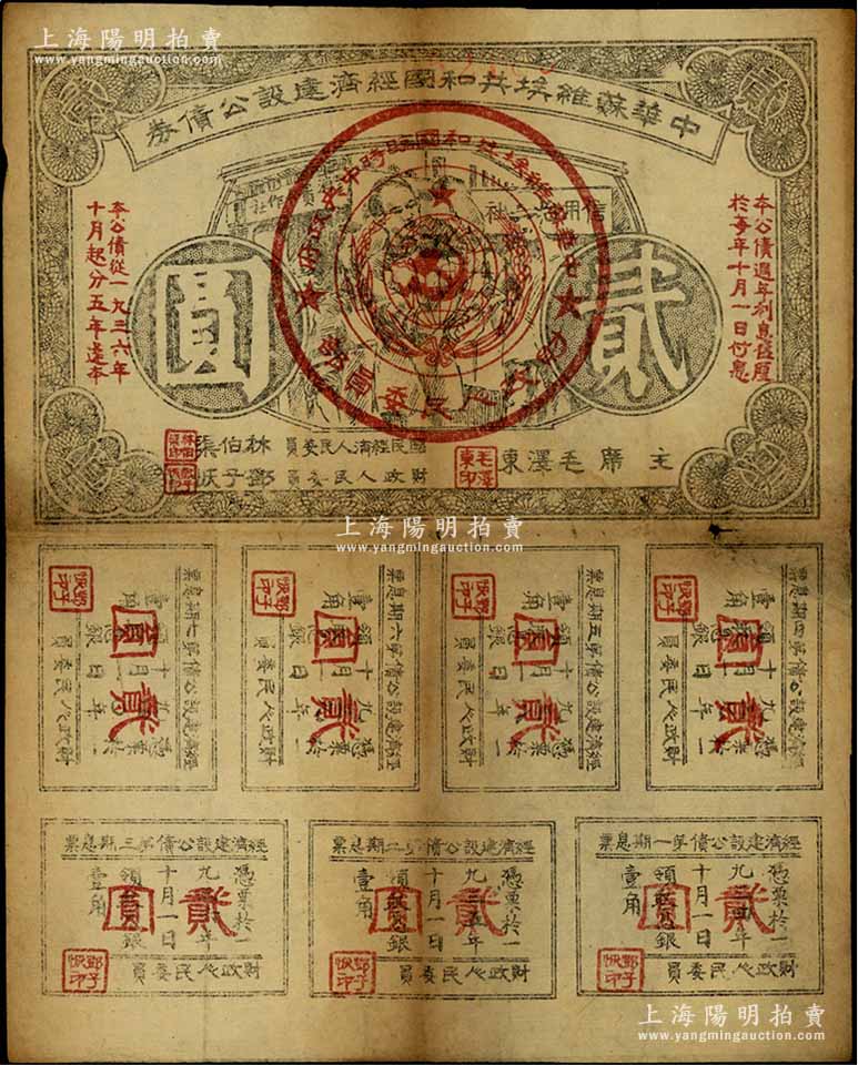 1936年中华苏维埃共和国经济建设公债券贰圆,由毛泽东、林伯渠等署名发行;前辈藏家出品,七成新