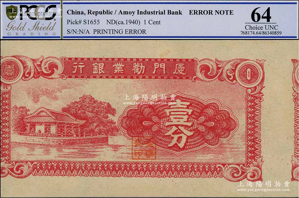 厦门劝业银行壹分,错版券·正面图案左右印刷移位,而背面图案印刷正常,颇具趣味,九八成新