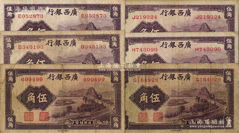 广西银行无年份中华版通用辅币伍角共6枚,紫色象鼻山图,分别为无字轨和单B、E、G、H、J字轨券;澳门陈耀光先生藏品,七至八成新