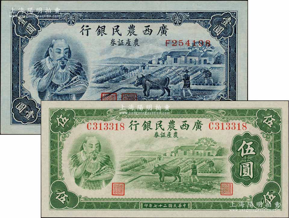 民国二十七年(1938年)广西农民银行农产证券壹圆、伍圆共2枚全套,上印神农氏像;澳门陈耀光先生藏品,九八至全新
