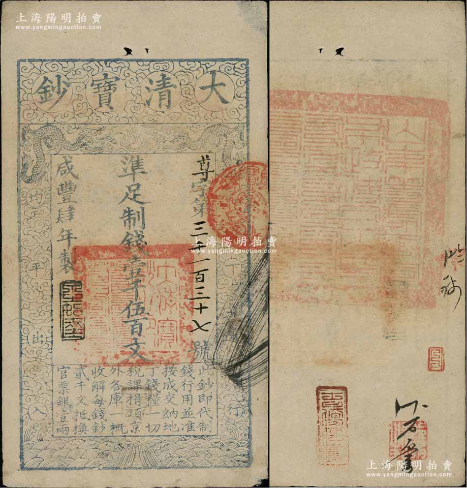 咸丰肆年(1854年)大清宝钞壹千伍百文,尊字号,年份之下有“泉之始达”之闲章,背盖满汉文“山东等处承宣布政使司之印”大关防,且有背书数处;前辈藏家出品,八成新