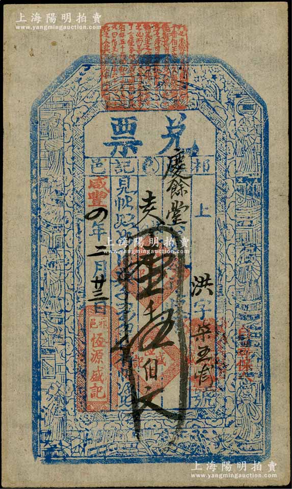 咸丰四年(1854年)恒源盛记“兑票”大钱壹千伍佰文,山西祁县钱庄钞票,上印八仙图,少见,八五成新